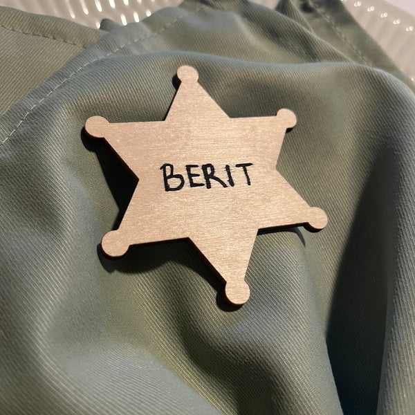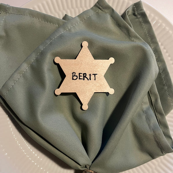 Bordkort formet som en sherifstjerne. Vores bordkort med sherif-tema passer perfekt til barnedåben, konfirmationen eller fødselsdagen.