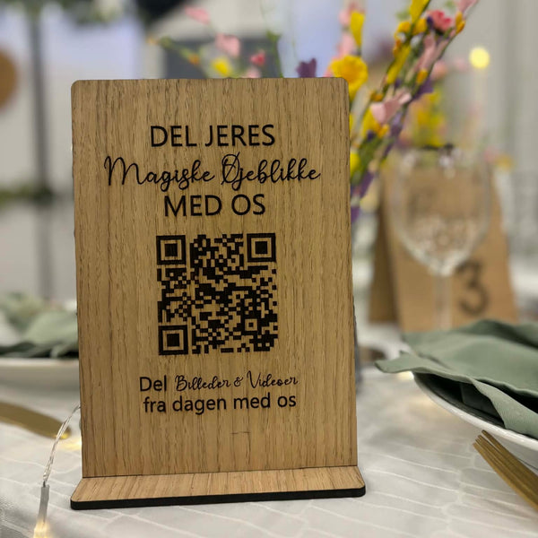 Det dekorative QR-skilt er designet med kærlighed og blik for detaljen, og det fungerer som et naturligt samlingspunkt for billeder fra jeres dag. Når gæsterne scanner den graverede foto QR-kode med deres telefon, føres de direkte til jeres udvalgte delingsside – ingen apps, ingen login, bare nem og hurtig billeddeling.