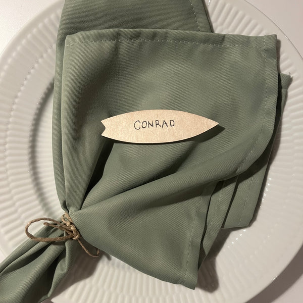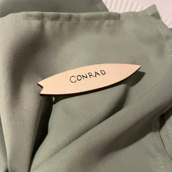 Bordkort formet som et surfboard. Vores bordkort med surfer tema passer perfekt til barnedåben, konfirmationen eller fødselsdagen.
