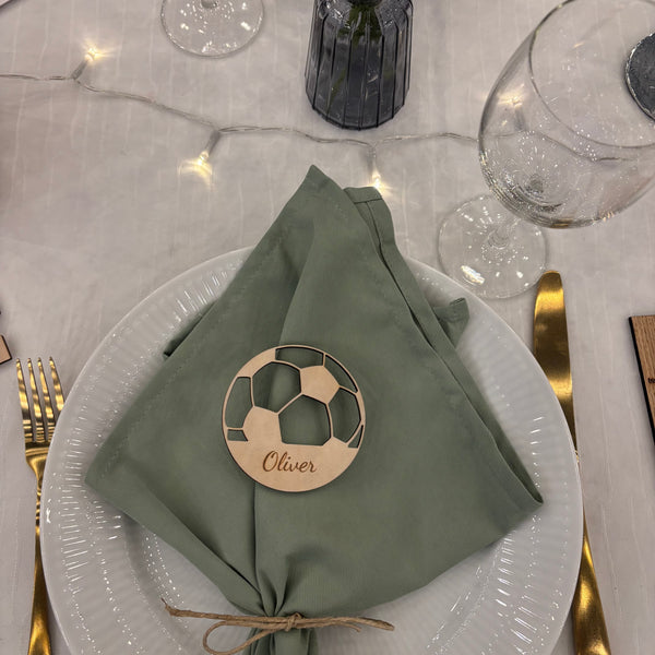 Unikke bordkort udformet som en fodbold med graveret navn i træfiner eller akryl.