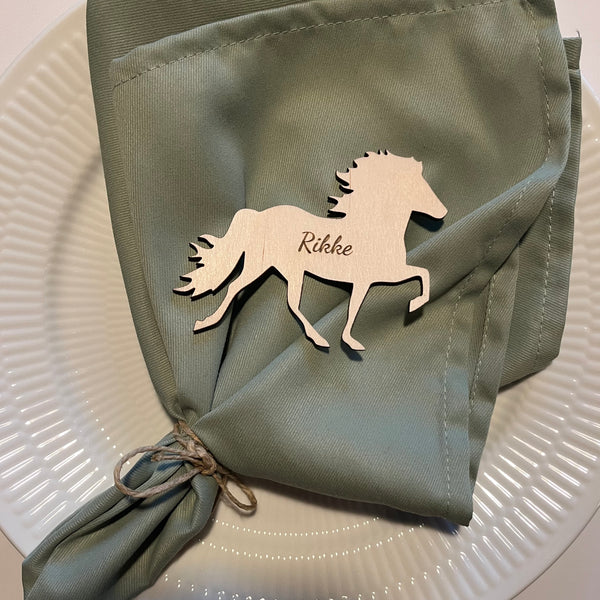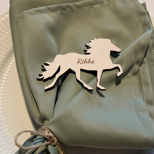 Unikke bordkort udformet som en islandsk hest med graveret navn i træfiner eller akryl.