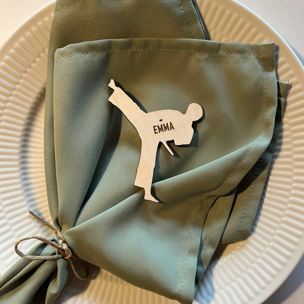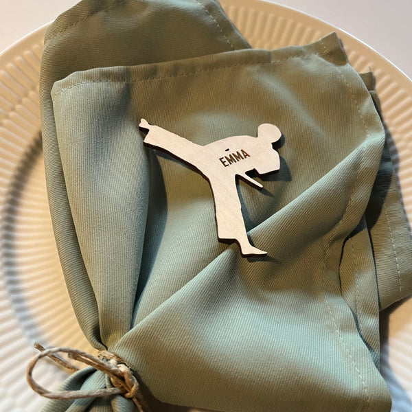 Unikke bordkort udformet som en karateudøver med graveret navn i træfiner eller akryl.