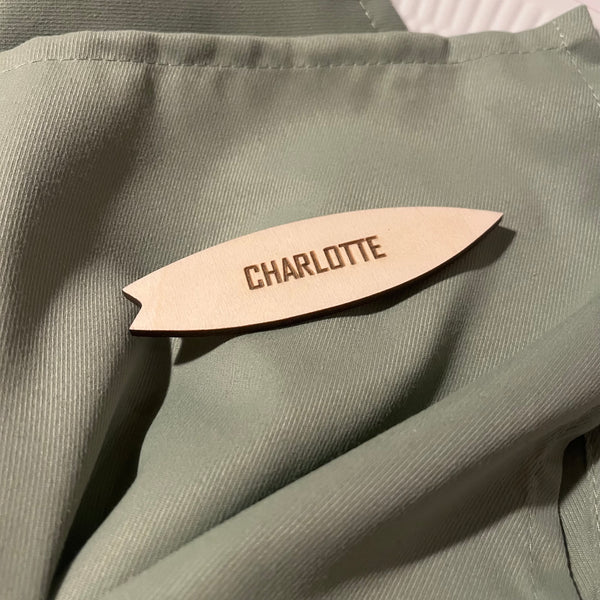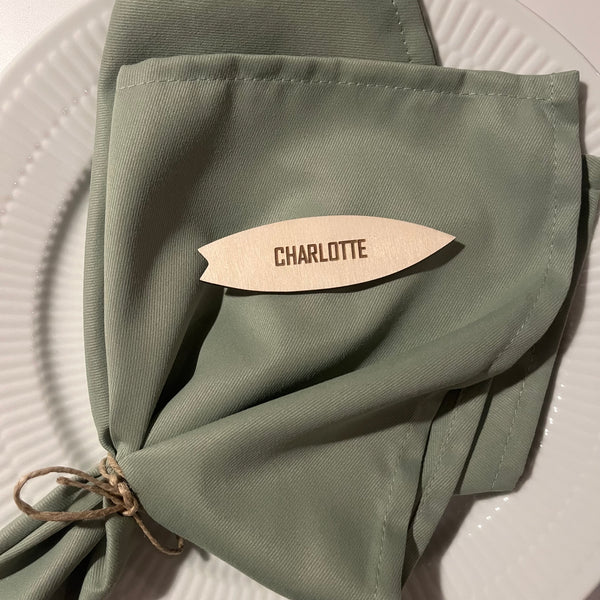 Unikke bordkort udformet som et surfboard med graveret navn i træfiner eller akryl.