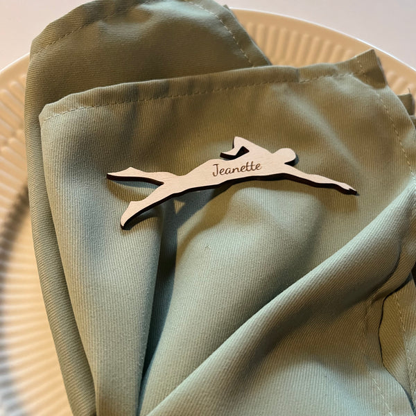 Unikke bordkort udformet som en svømmer med graveret navn i træfiner eller akryl.