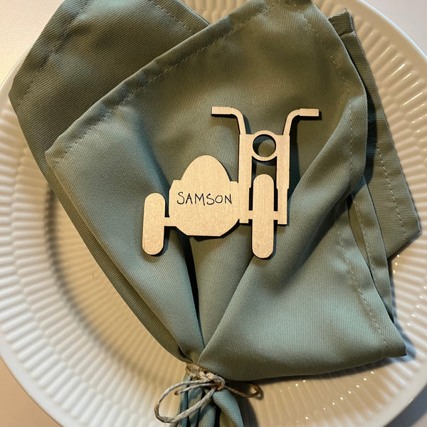 Bordkort formet som en motorcykel med sidevogn. Vores bordkort med motorcykel tema passer perfekt til barnedåben, konfirmationen eller fødselsdagen.