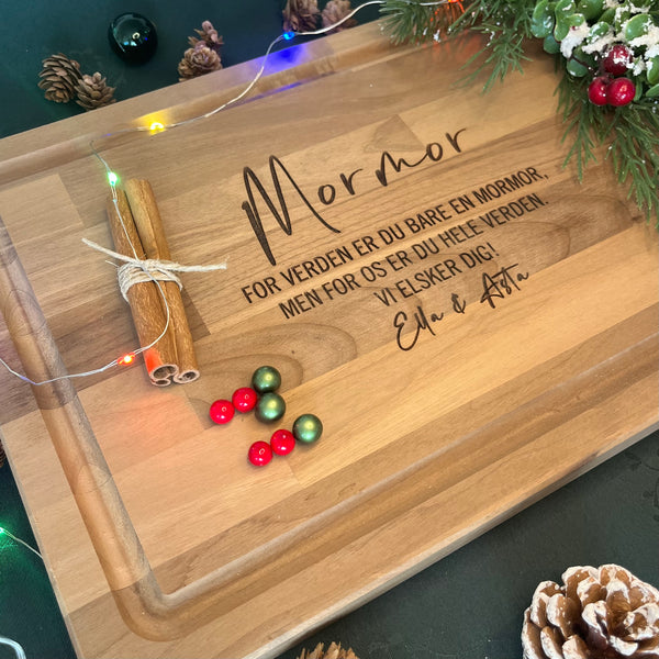Glæd én du holder af med et personligt skærebræt, graveret med tekst efter dine ønsker.